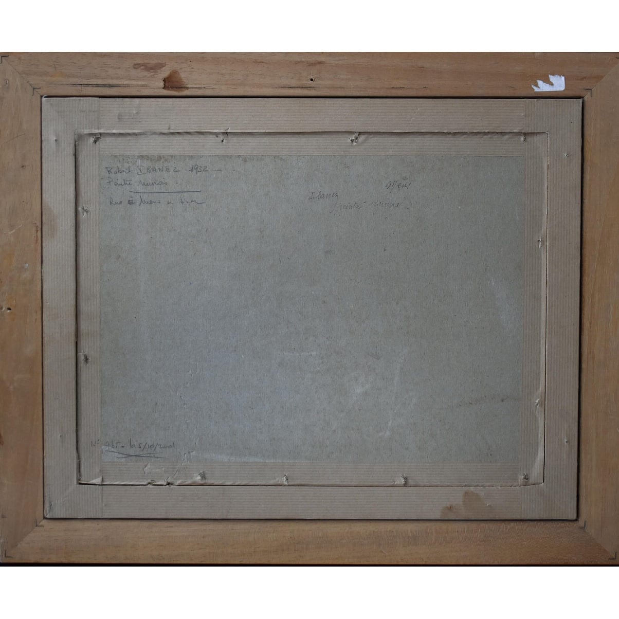 This evocative watercolor by French artist Robert Ibanez captures a snow-covered village street under a heavy, wintry sky. Painted in 1978, the work is rendered in a restrained monochrome palette, with delicate washes of grey, black, and sepia—hallmarks of Ibanez’s poetic sensitivity to atmosphere and memory. Snow blankets the rooftops and pavements, softening the hard outlines of the stone buildings and muffling the quiet life within, evoking a deep sense of solitude and calm.
